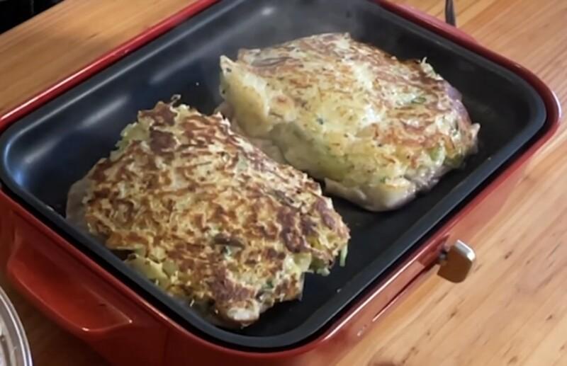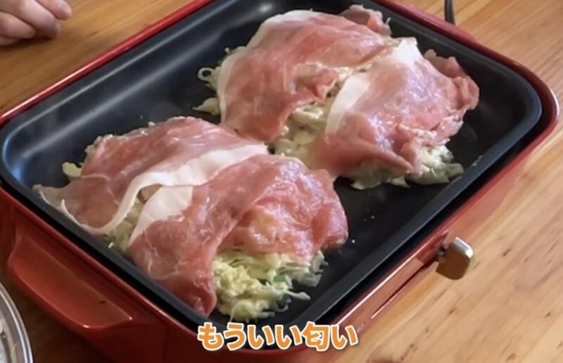 1. 油を引いたフライパンやホットプレートを中火にし生地を円形に広げ入れ、上から豚肉をのせ中弱火で5分焼く。