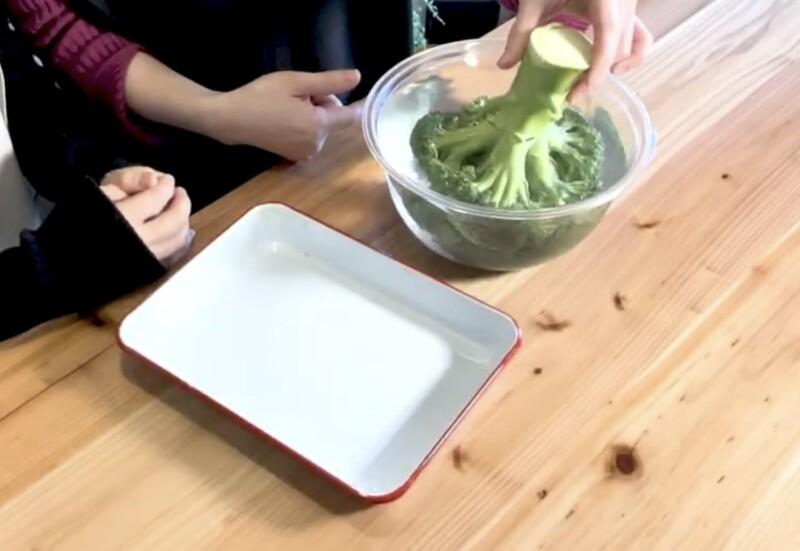 - ブロッコリーをカット前にそのままお湯に浸す(2〜3分)。