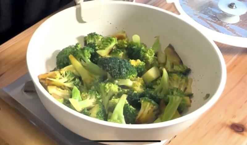 - 弱めの中火に熱したら、ブロッコリーの切り口(断面)を下にして並べる。