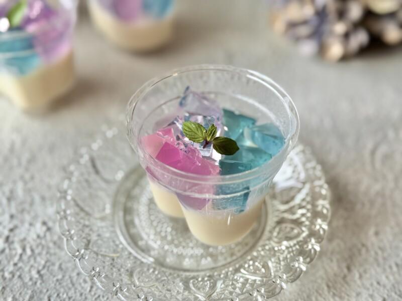 お好みの形にクラッシュした3色の紫陽花ゼリーをトッピング♪