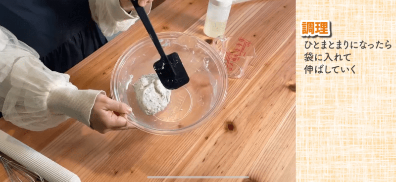 - まとまってきたら、生地をポリ袋(またはラップ)に入れる。